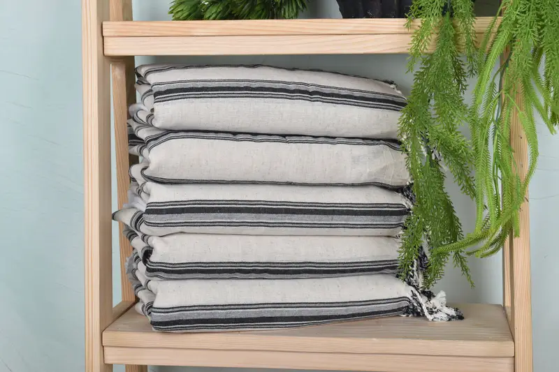 These beach towels are composed of organic cotton and linen, ensuring a blend of durability and softness. Characterized by a sub-category of wedding gifts, they exhibit a length of 38 inches and a width of 71 inches, with a weight of 250 grams. Each towel is meticulously woven by hand, resulting in slight variations up to 1-2.5 centimeters due to their handmade nature.