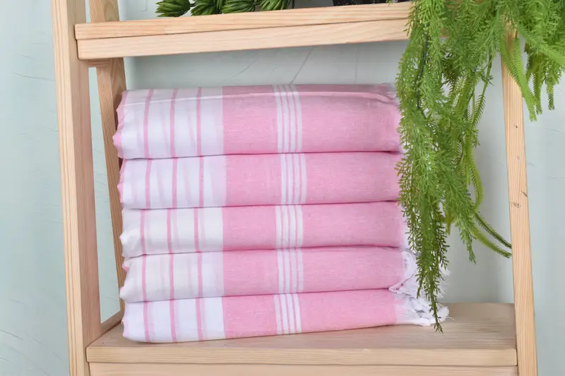 Light pink cotton towels, characterized by high absorbency and durability, are woven from organic cotton and linen, ensuring a soft texture and long-lasting quality. The towels measure 36x67 inches and weigh 200 grams, with slight variations due to the hand-weaving process. Customization includes embroidery of names, initials, or logos, and orders are shipped within 1-2 days, with personalized items subject to specific return conditions.