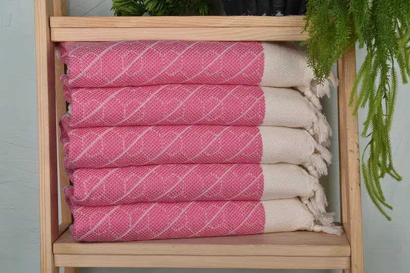The 18"x36" pink cotton hand towels are crafted from organic cotton and linen, ensuring durability and high absorbency. Measuring 36x18 inches and weighing 120 grams, these towels are made using a traditional weaving loom, resulting in slight variations of 1-2.5cm in size and weight due to their handmade nature. Customized embroidery options are available, featuring options such as names, initials, or logos in selected fonts and thread colors. Towels are shipped within a day of order, with international shipments originating from Turkey. Pre-wa...