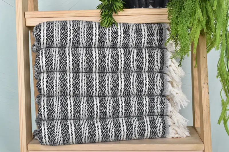 The 18"x32" Black Cotton Dish Towel is characterized by its multi-material composition of organic cotton and linen, ensuring a soft yet durable texture. These towels are meticulously woven by hand, resulting in minor variations of up to 2.5cm in dimensions and slight weight fluctuations. Featuring a weight of 120 grams, these towels are pre-shrunk, allowing for consistent sizing.