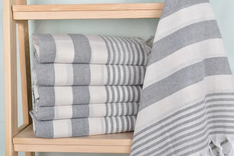 The 36x67-inch towel is composed of organic cotton and linen, ensuring durability and comfort. Characterized by a weight of 200 grams, it may have slight dimensional variations due to its handmade nature, with tolerances up to 2.5 cm. Towels are pre-washed, ready for first use, and can be washed at 30 degrees in 600 cycles with a softener.