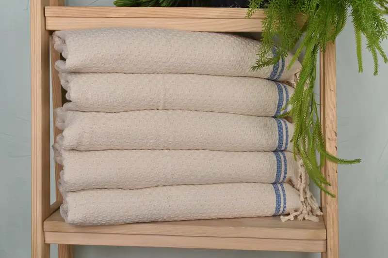 The dish towels are characterized by their composition of organic and recycled cotton, ensuring durability and sustainability. Each piece, measuring 38 inches by 18 inches, has a weight of 120 grams, and handmade variations can occur within a 1-2.5 cm tolerance. Pre-washing is recommended before first use, with machine washing at 30 degrees and 600 cycles, and both air and dryer drying methods are viable.