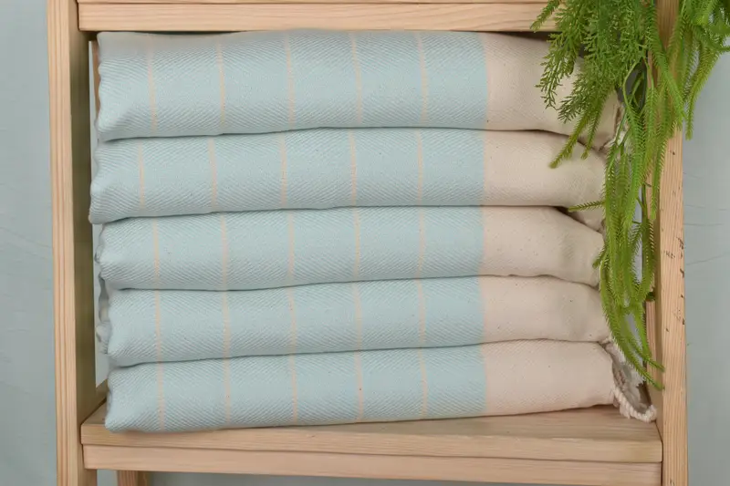 Fiber composition is critical for towel performance, ensuring durability and absorbency. Characterized by organic cotton and linen, these towels exhibit a robust structure suitable for kitchen use. Weight and dimensions are specified at 100 grams and 36x16 inches respectively, with slight variations due to hand-weaving.