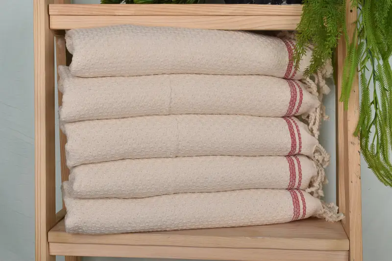 Each towel is crafted from organic cotton and linen, ensuring a balance of durability and softness, characterized by enhanced absorbency. The standard dimensions are 38 x 18 inches with a weight of 120 grams, with slight variations due to hand-weaving resulting in tolerances of up to 2.5 cm. Orders include detailed customization options, from embroidery of names and initials to personalized logos, with shipping handled within one day through DHL Express or Fedex.