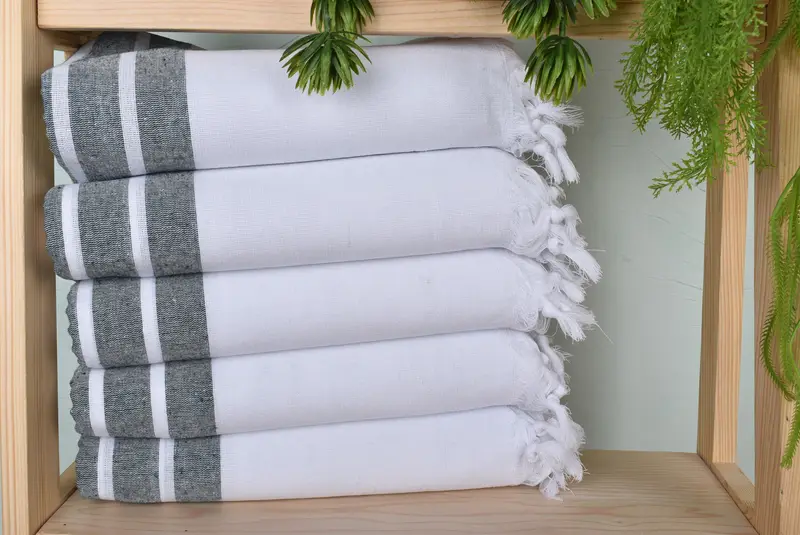The Turkish towel is characterized by its blend of organic cotton and linen, ensuring exceptional absorbency and durability. Measuring 70 x 40 inches (177.8 x 101.6 cm), it weighs 220 grams, with minor variations due to its hand-weaving process. Orders are packed and shipped within a day via DHL Express or Fedex, with a delay of up to 2 days for personalized items.