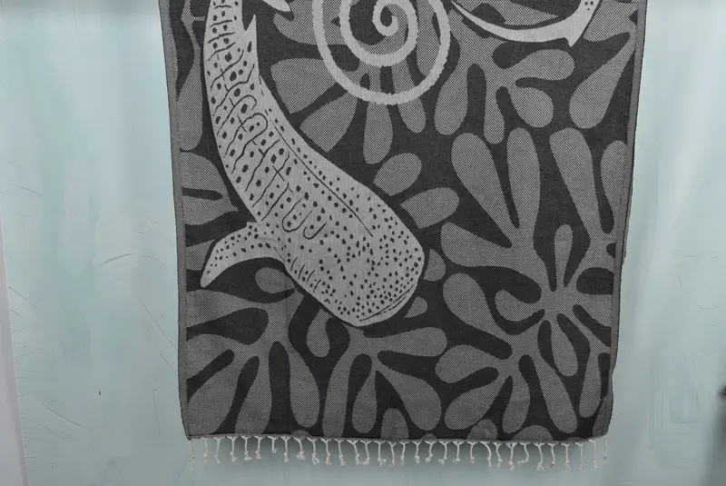 Characterized by a blend of organic cotton and linen, this beach towel ensures durability and breathability. Dimensions are specified as 70x40 inches with a weight of 450 grams, allowing for variations due to hand-weaving. Resulting in a tolerance range of 1-2.5 cm.
