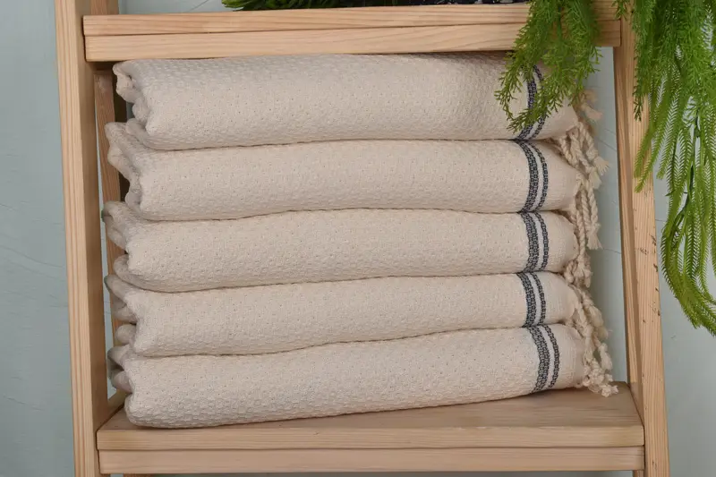 Fabric characteristics ensure robust, absorbent properties. The towels are crafted from organic cotton and linen, resulting in a weight of 120 grams. This material blend is characterized by slight variations in size and weight due to hand-weaving tolerances of up to 1-2.5 cm.
