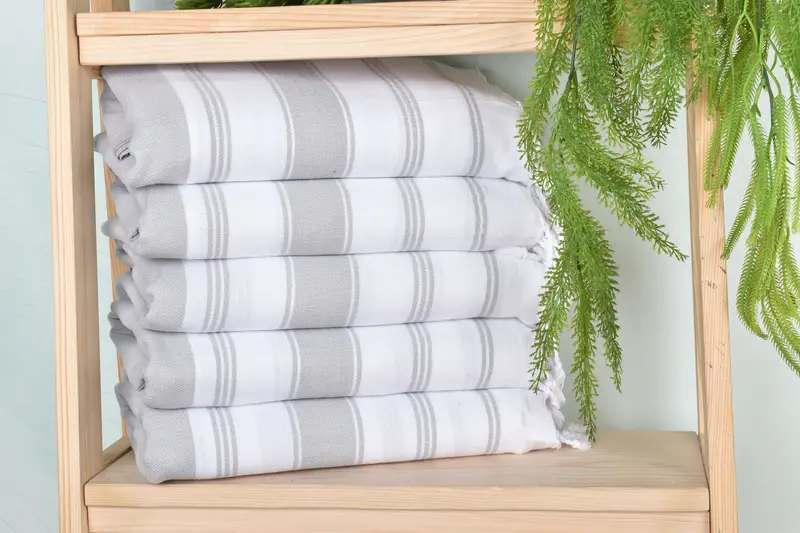 Crafted from organic cotton and linen, the 40x71 inches light gray bath towel ensures both durability and absorbency. Characterized by a hand-weaving process, this light gray striped towel features a slight tolerance in dimensions, up to 2.5 centimeters, and a weight of 310 grams. Embroidery customizations for names, initials, or logos are available, and the towel is pre-washed before shipping, ready for immediate use.