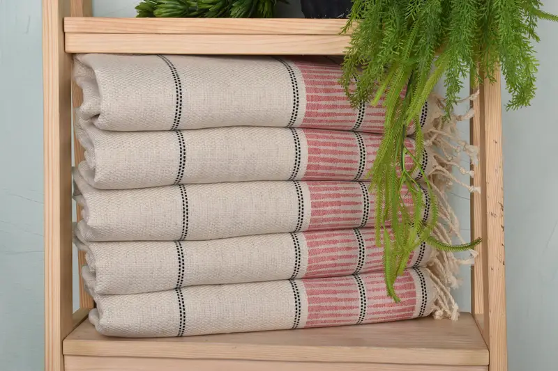 The dish towel is composed of organic cotton and linen, ensuring superior absorbency and breathability. Dimensions are 40x20 inches, weighing 120 grams, with hand-weaving tolerances of up to 1-2.5 cm. Embroidery customization is available with options for names, initials, or logos. Pre-washed and ready for use, these towels can be washed at 30 degrees and dried using both air and dryer methods.