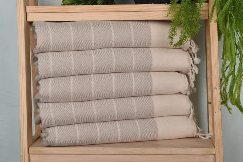 The hand towels are woven from a blend of organic cotton and linen, ensuring a soft texture and superior absorbency. Characterized by a length of 36 inches and a width of 16 inches, these towels weigh 100 grams. Variations in dimensions and weight of up to 1-2.5cm can occur due to their handmade nature.