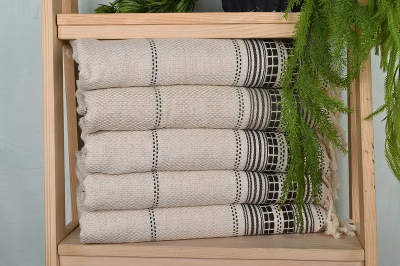 The hand towels are constructed from a blend of organic cotton and linen, ensuring a high degree of absorbency and breathability. Weighing 120 grams and measuring 40x20 inches, these towels exhibit slight variances in size and weight due to their handcrafted nature. Each piece is meticulously woven on a loom, resulting in potential deviations within a range of 1-2.5cm.