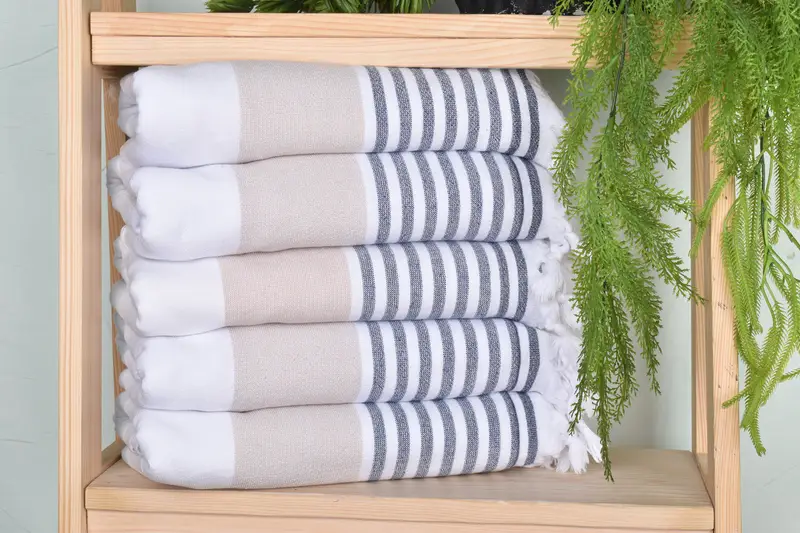 The striped terry towel is characterized by its organic cotton and linen composition, ensuring exceptional absorbency and comfort. Measuring 67 x 36 inches (170.18 x 91.44 cm) and weighing 400 grams, these towels are meticulously handwoven with slight variations of up to 2.5 cm due to their handcrafted nature. Customers can personalize these towels with names, initials, or logos, adhering to specific placement guidelines for embroidery. Pre-washed and ready for use, these towels can be machine washed at 30 degrees Celsius with a 600-cycle limit...