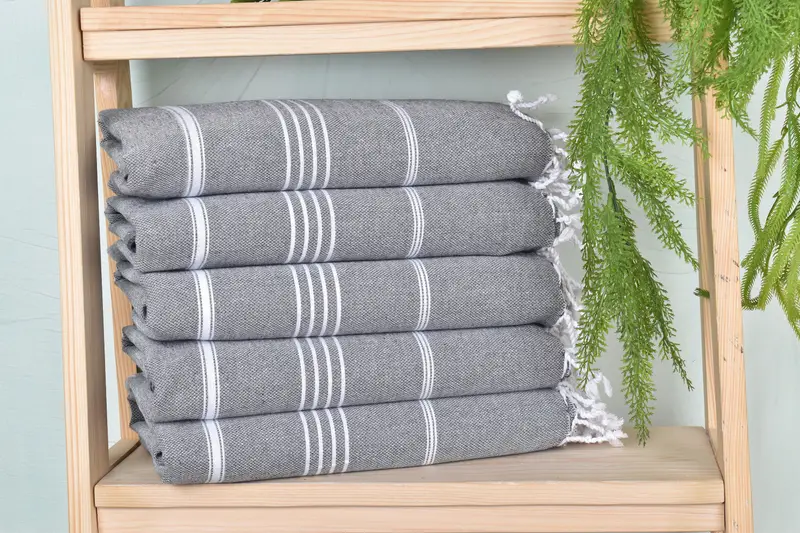 Organic cotton and linen blend towels ensuring durability and sustainability. Resulting in an absorbency that maximizes moisture retention. Characterized by hand-weaving that introduces minor dimensional variances up to 2.5 cm.