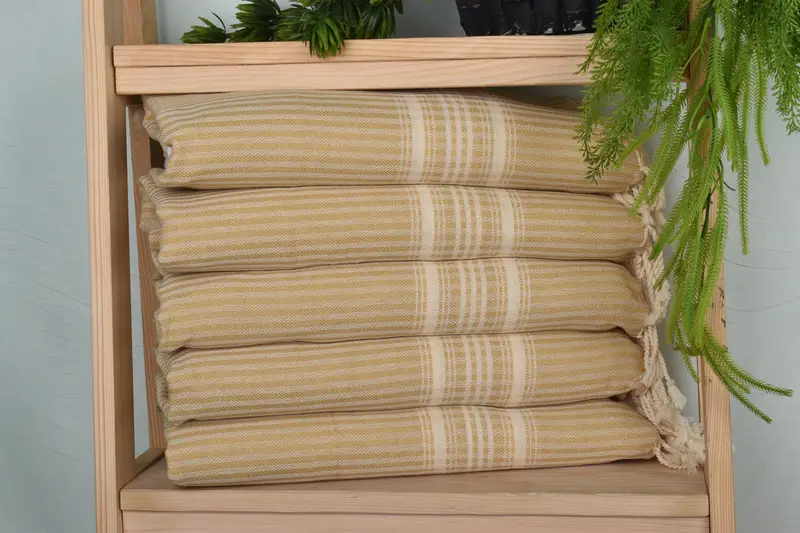 The hand towels are composed of organic cotton and linen fibers, ensuring durability and softness. Each towel measures 40x18 inches and weighs 90 grams, with minor variations possible due to the handmade nature. Weaving techniques result in dimensions that may vary by up to 1-2.5cm.