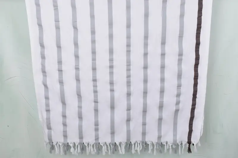 The towels are crafted from organic cotton and linen, ensuring a high-quality material that provides excellent absorbency. Each towel has dimensions of 38x73 inches and weighs 400 grams. Due to the handmade nature of these towels, slight variations in size and weight may occur, with a tolerance of up to 1-2.5 cm.