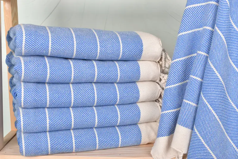 The towels are characterized by their composition of organic cotton and linen, ensuring optimal absorbency and durability. Length and width are precisely 38 x 71 inches, with a weight of 360 grams. Hand weaving may result in minor variations, typically within 1-2.5 cm.