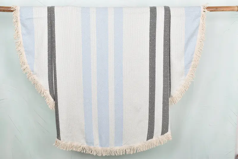 The round diamond towel is characterized by a blend of organic cotton and linen, ensuring optimal absorbency and breathability. Dimensions measure 63x63 inches, with a weight of 600 grams, hand-woven with minor variations up to 2.5 cm due to artisanal craftsmanship. Customization options include embroidery of names, initials, or logos, with specific preferences regarding placement and font. Pre-shrunk status ensures durability post-wash. Towels should be washed before first use at 30 degrees Celsius with a gentle detergent, air-dried or tumble-...