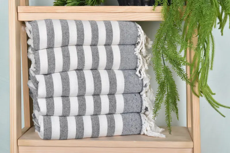 Organic cotton/linen composition ensures exceptional softness and absorbency, resulting in a high-quality towel for diverse uses. Characterized by handmade striping, the towels measure 40x67 inches and weigh 422 grams. Hand-weaving tolerances may result in slight size variations of up to 1-2.5cm.