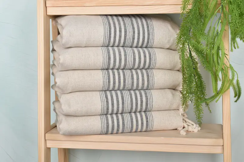 The woven beach towel is crafted from a blend of organic cotton and linen, ensuring both durability and breathability. Characterized by its 40x79 inches dimensions and a weight of 315 grams, this handwoven product may exhibit slight variations in size due to its artisanal nature. Customization is available, allowing for embroidery of names, initials, or logos with specific font and thread color preferences.