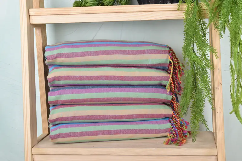 Organic Cotton/Linen fiber composition ensures high absorbency and durability, resulting in a towel that is both soft and long-lasting. The dimensions of the towel are 36x71 inches, weighing 200 grams. Due to the hand-weaving process, variations in size and weight of up to 1-2.5cm may occur.