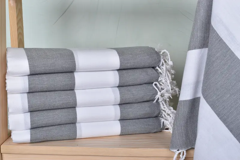 The organic cotton/linen composition ensures the towels are soft, durable, and highly absorbent, making them ideal for beach, yoga, and bath use. Characterized by a length of 40 inches and width of 71 inches, these towels have a weight of 290 grams, with a slight variance due to the hand-weaving process. Orders are personalized upon request, with embroidery options for names, initials, or logos. All orders are shipped within a day, except for personalized items, and returns are accepted within 7 days, excluding custom orders.