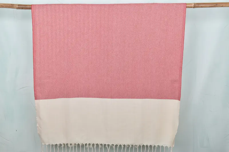 This collection comprises 36x71 inches red cotton towels, characterized by a zig-zag pattern. Comprising organic cotton and linen, the material ensures high absorbency and durability. Each towel exhibits a weight of 400 grams with hand-weaving tolerances between 1-2.5cm in size.