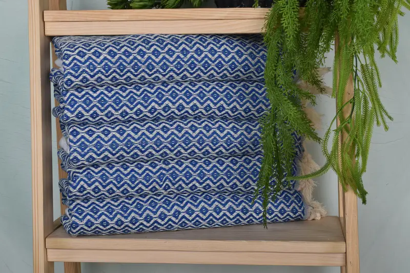 Fiber composition includes organic cotton and linen, characterized by high absorbency and durability. The dimensions are 36x18 inches with a weight of 120 grams. Variations of 1-2.5 cm in size and weight are expected due to hand-weaving.