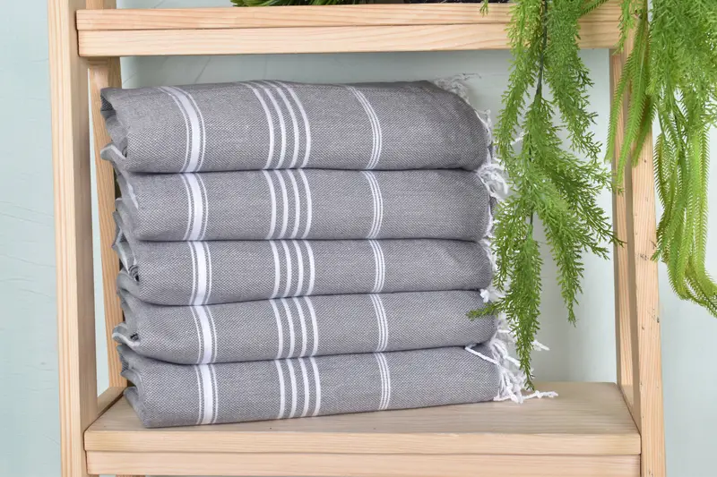 The Turkish Bath Towel is characterized by its fiber composition of organic cotton and linen, ensuring superior absorbency and durability. Measuring 40x71 inches and weighing 280 grams, the towel is handcrafted which results in minor variations of up to 1-2.5cm in its dimensions. Embroidery customization is available for personalized towels, with options for names, initials, or logos embroidered in specified fonts and thread colors.