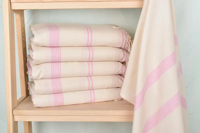 Organic cotton/linen composition ensures superior absorbency, characterized by a soft and durable texture. The towels are meticulously woven on a loom, resulting in dimensions of 36x71 inches and a weight of 290 grams with a tolerance of up to 1-2.5 cm due to handmade nature. Customization through embroidery with names, initials, or logos is available, accompanied by flexible shipping and return terms to cater to personalized orders.