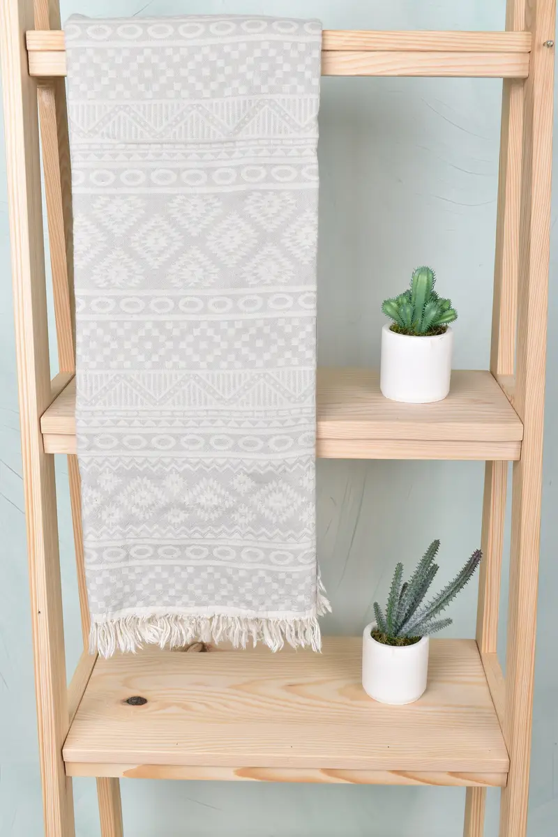 Constructed from organic cotton and linen, the Personalized Turkish Beach Towel is characterized by its light gray hue and geometric design. Ensuring high absorbency and soft texture, this product measures 36x67 inches and weighs 320 grams. Due to the hand-weaving process, dimensions may vary slightly by up to 1-2.5cm.