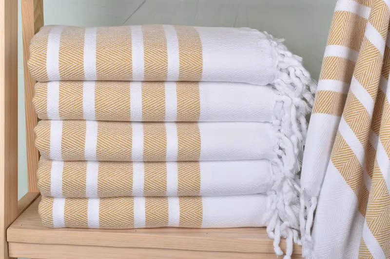 The towels are woven from a blend of organic cotton and linen, ensuring high-quality absorbency and durability. Characterized by a length and width of 40x71 inches, the towels weigh 380 grams, with minor variations due to the handmade nature of the weaving process. These tolerances may result in dimensional discrepancies of up to 1-2.5 centimeters.