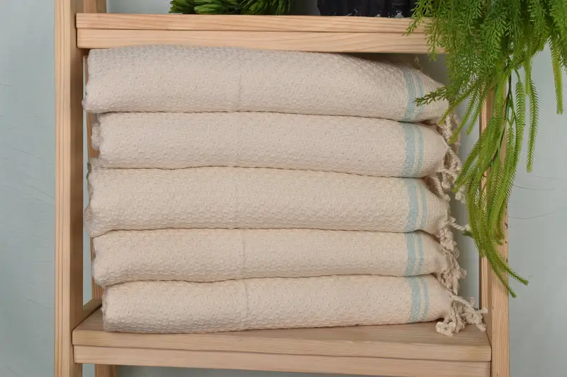 Organic cotton and linen blend ensures a comfortable and durable hand towel, characterized by excellent absorbency and breathability. The dimensions of the towel are 38x18 inches, with a weight of 120 grams. Hand-weaving introduces minor variations within a tolerance of 1-2.5cm.