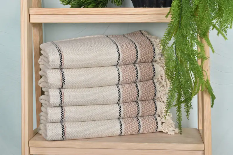 Characterized by its superior absorbency, the Turkish Bath Towel is crafted from a blend of organic cotton and linen, ensuring durability and breathability. Measuring 36 by 71 inches and weighing 430 grams, it presents slight variations due to the hand-weaving process, typically within 1-2.5 centimeters. Embroidery customization, including names, initials, or logos, is available with options for font and placement, enhancing personalization.