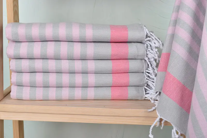 The Turkish Towel is constructed from a blend of organic cotton and linen, ensuring high absorbency and durability. Characterized by a length of 40 inches and a width of 71 inches, the towel weighs 260 grams, with minor variations due to its hand-weaving nature. Embroidery customization is available for names, initials, or logos, with specific placement and font selection options offered.