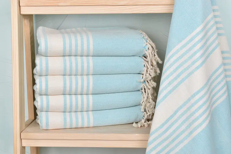 The organic cotton and linen blend ensures a durable and absorbent texture, ideal for beach towels. These towels measure 40x67 inches, weigh 350 grams, and exhibit slight size variations due to hand-weaving precision. Embroidery customization is available, enabling names, initials, or logos on Turkish towels. All orders are shipped within a day, with possible delays for personalized orders. Returns are accepted within seven days, excluding personalized items. Pre-wash is recommended before first use, and washing at 30 degrees is advised.