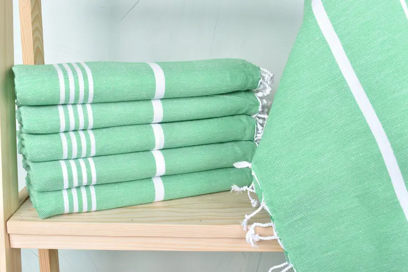 Organic cotton/linen composition ensures optimal absorbency and breathability, characterized by soft texture and quick-drying features. Dimensions span 40x71 inches with a weight of 266 grams; hand-weaving allows size tolerances of 1-2.5cm. Personalization options include embroidery of names, initials, or logos in chosen fonts and thread colors.