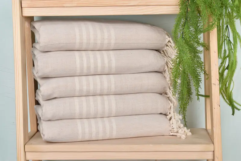 Organic cotton and linen composition ensures superior absorbency and durability, characterized by a light beige hue. Dimensions specify a length of 40 inches and width of 71 inches, with a weight of 300 grams. Due to hand-weaving, size and weight could vary slightly by up to 1-2.5 cm.
