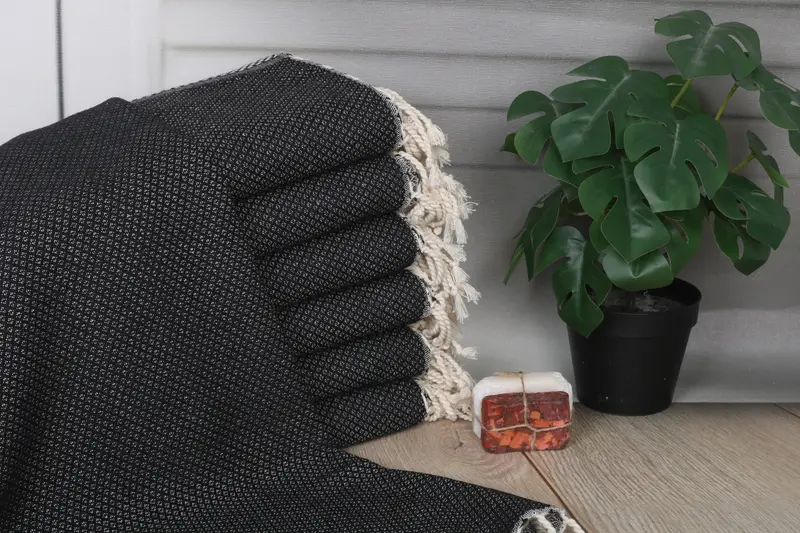 Characterized by its 38"x63" dimensions, the towel is fabricated from organic Turkish cotton or natural linen, ensuring exceptional durability and soft texture. Weighing 380 grams, the precise fiber composition guarantees optimal absorbency and comfort, resulting in a towel that efficiently dries hands and skin. Featuring a tolerance range of 1-2.5cm due to hand-weaving techniques, this product consistently meets high-quality standards.