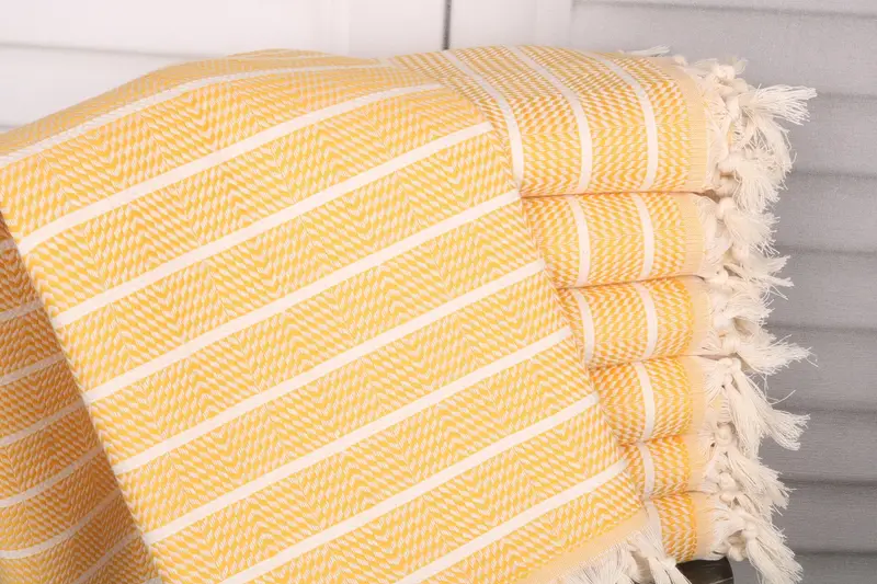 Constructed from organic Turkish cotton, the 40x71 inches mustard cotton towel ensures superior absorbency and soft texture. Characterized by a weight of 440 grams and dimensions of 100x180 cm, this beach towel adheres to hand-weaving tolerances of 1-2.5 cm, ensuring precise sizing. Providing customization options such as embroidery and monogramming, the towels are pre-shrunk and shipped within 2-5 days. Delivery is managed through DHL Express, FedEx, and UPS, with returns accepted within seven days for non-personalized items.