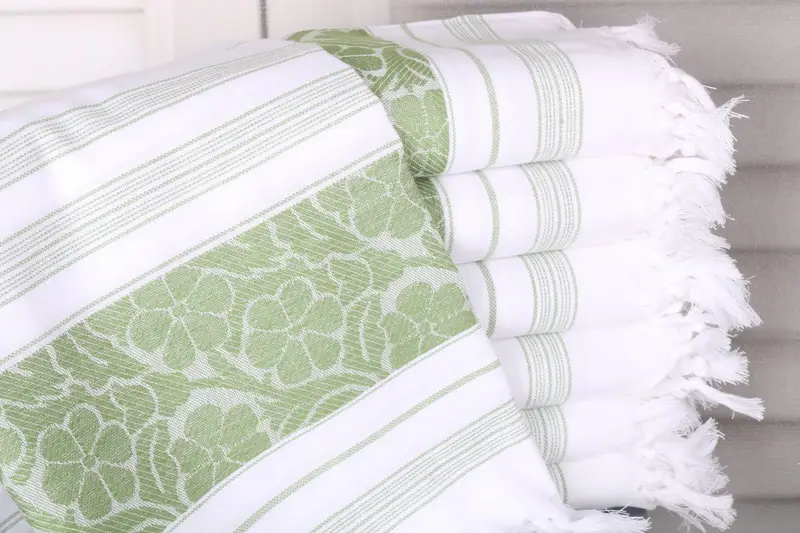 Composed of organic Turkish cotton or natural linen, the towels exhibit high absorbency and durability, resulting in a lightweight and practical piece for various uses. Characterized by a robust weave, they maintain structural integrity while providing comfort.