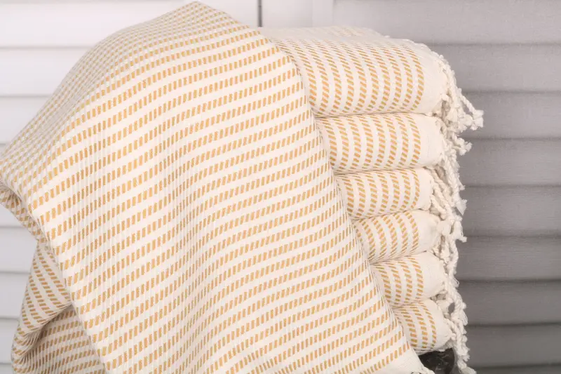 Organic Turkish cotton ensures an exceptionally soft and absorbent beach towel. Characterized by a weight of 340 grams and dimensions of 40x71 inches (100x180 cm), these towels exhibit a tolerance of 1-2.5 cm in hand-weaving.