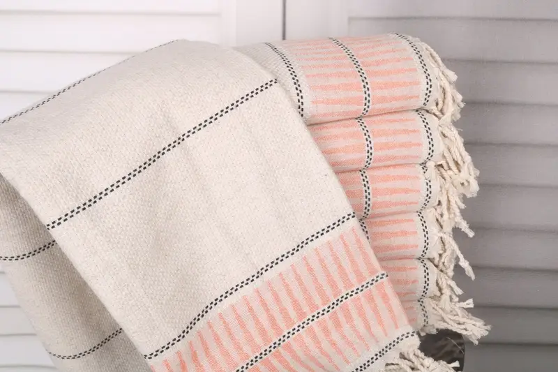 Characterized by their lightweight nature, these towels are crafted from organic Turkish cotton or natural linen, ensuring premium absorbency and breathability. Measuring 40x71 inches or 100x180 centimeters, with a weight of 340 grams, these towels exhibit precise hand-weaving techniques resulting in tolerances of 1-2.5 centimeters. Customization options include embroidery, monogramming, or personal messages on the towels, with attention to detail ensuring the pre-shrunk status for consistent dimensions.