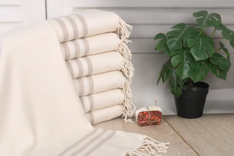 Characterized by its high absorbency and durability, the Personalized Turkish Beach Towel is constructed from organic Turkish cotton or natural linen. Ensuring superior comfort and functionality, the towel's 70x40 inches (100x180 cm) dimensions and 250 grams weight provide a plush texture and long-lasting use. Resulting in a finished product with a hand-weaving tolerance of 1-2.5 cm, this towel is designed to meet rigorous quality standards.