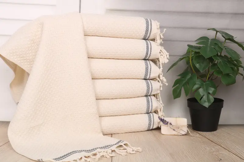 Turkish cotton fiber composition ensures high absorbency and durability. The hand towel measures 38x18 inches (95x45 cm) and weighs 120 grams, characterized by a 1-2.5cm tolerance in hand-weaving.