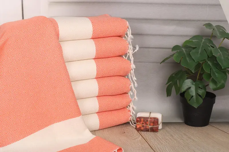 Characterized by high absorbency, the 20"x40" Orange Cotton Tea Towel is composed of organic Turkish cotton or natural linen, ensuring durability and sustainability. Resulting in a lightweight yet sturdy towel, the dimensions of 40x20 inches or 50x100 cm, along with a weight of 120 grams, offer precise measurements. Providing customization options, the towel features hand-weaving tolerances within 1-2.5 cm.