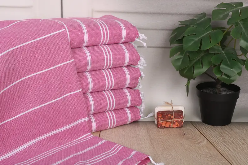 Characterized by high-quality fiber composition, the 24"x40" fuchsia cotton tea towel comprises organic Turkish cotton or natural linen, ensuring exceptional absorbency. Resulting in a lightweight product of 100 grams, the towels measure 40x24 inches or 60x100 cm with a hand-weaving tolerance of up to 1-2.5cm.