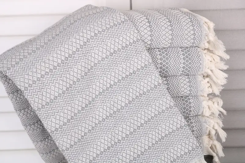 Organic Turkish cotton ensures exceptional absorbency and softness for the Diamond Towel. Characterized by its 40x71 inches (100x180 cm) dimensions and 300 grams weight, the towel offers a comfortable yet substantial texture. Hand-woven tolerances range from 1 to 2.5 cm.