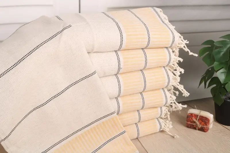 Characterized by superior absorbency, the Turkish towels are constructed from organic Turkish cotton or natural linen, ensuring a soft and durable fabric. Measuring 40x20 inches or 50x100 cm, and weighing 120 grams, each towel is handmade with a weaving tolerance of 1-2.5 cm. Tolerance in dimension is a result of the handwoven nature of the product.