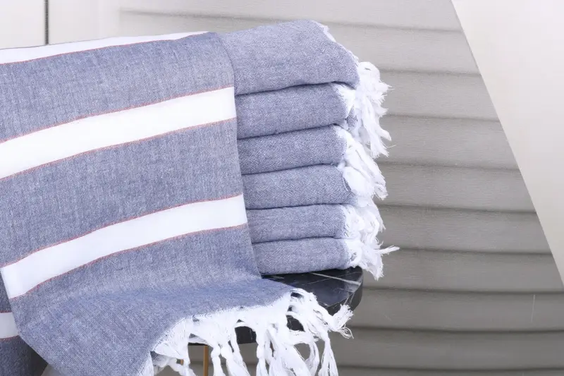 The 40x71-inch navy blue-red cotton towel is characterized by its organic Turkish cotton material, ensuring high absorbency and durability. Dimensions are precisely 100x180 cm, and the weight is 300 grams, with a hand-weaving tolerance of 1-2.5 cm. It allows for personalized embroidery or monogramming, enabling customization with specific letters, initials, or logos at the buyer's chosen font and color placement.