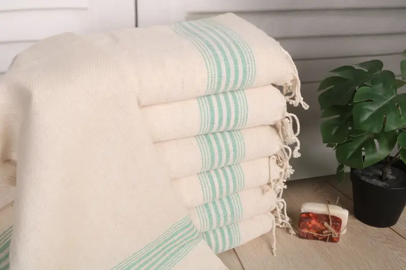 Turkish cotton and natural linen materials provide high absorbency, ensuring long-lasting use. The towel dimensions are 36x18 inches or 45x90 cm with a weight of 104 grams, presenting a precise tolerance of 1-2.5 cm.